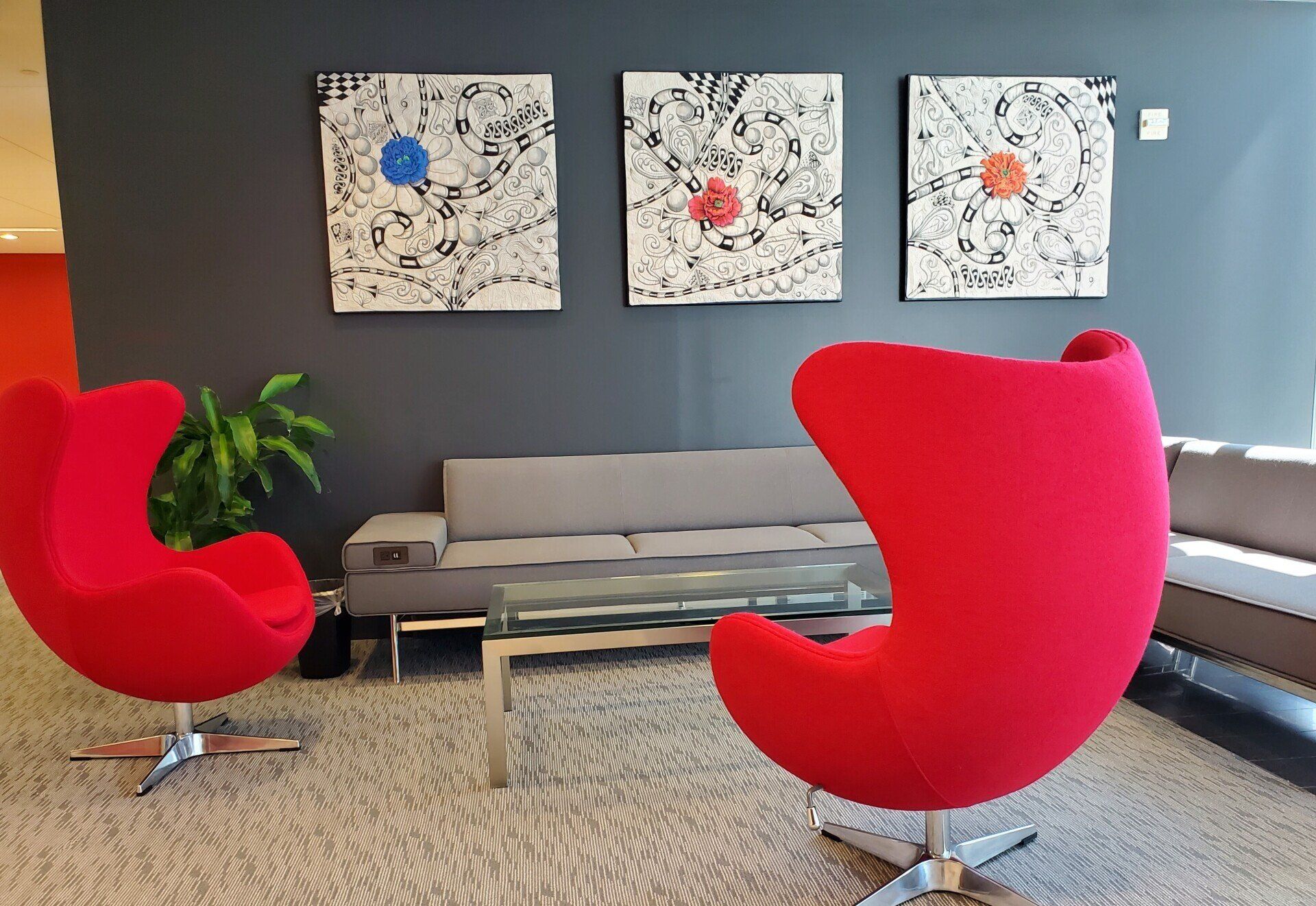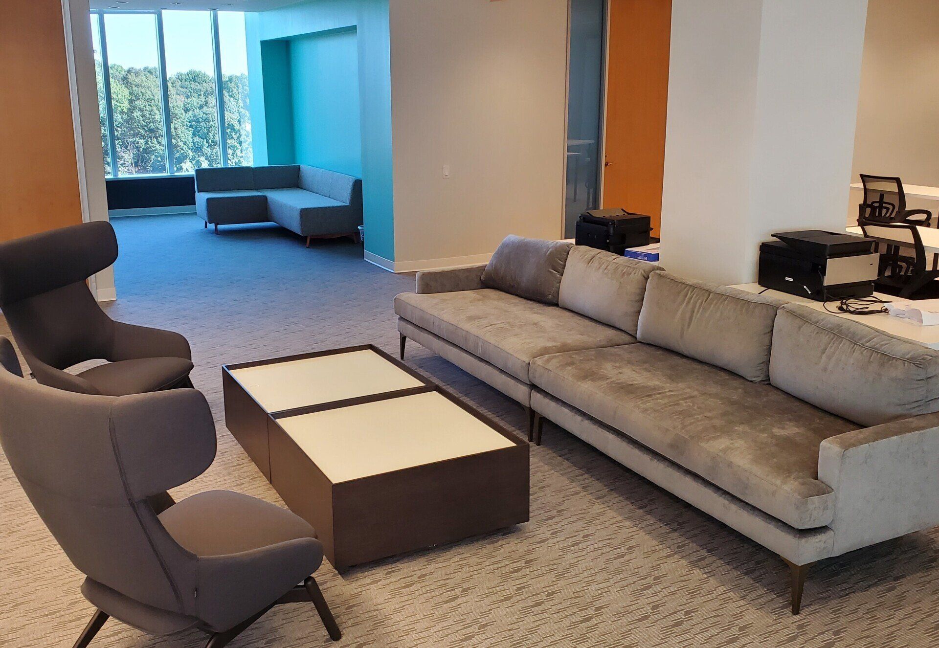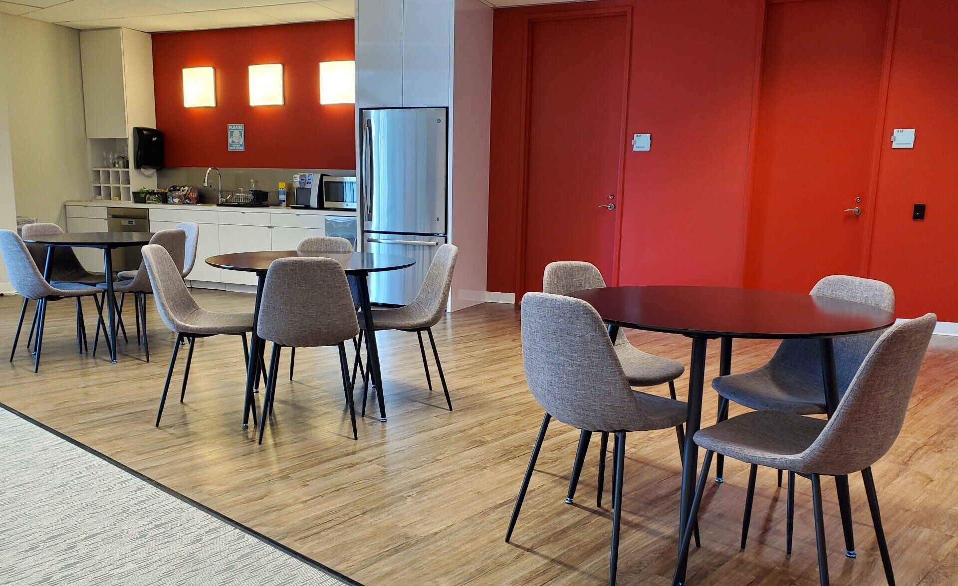 - Tables/sofas in building lobby and outdoor space